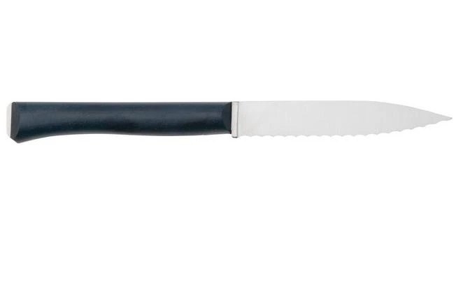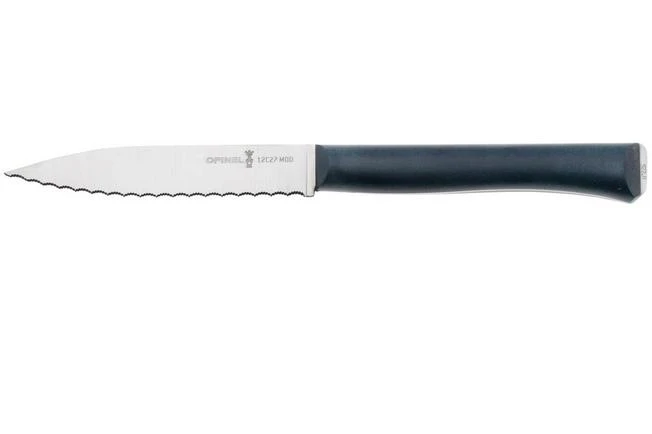 The Opinel Intempora serrated utility knife No. 226, 10 cm is a kitchen knife that might remind you of the famous Opinel pocket knives. The stylish plastic handle makes the knife look very elegant. This serrated knife with micro teeth is designed for slicing tomatoes, hard-boiled eggs, sausage and roasted meats.